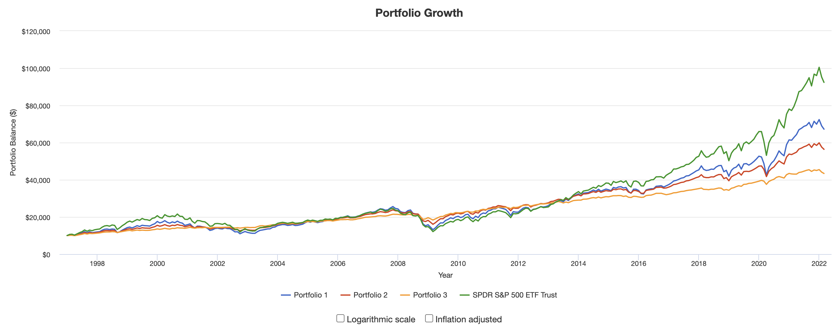 기본 포트폴리오에 비해 MDD는 조금 안 좋아졌고, 수익률은 좋아졌다. 하지만 여전히 S&P500에는 많이 부족하다.