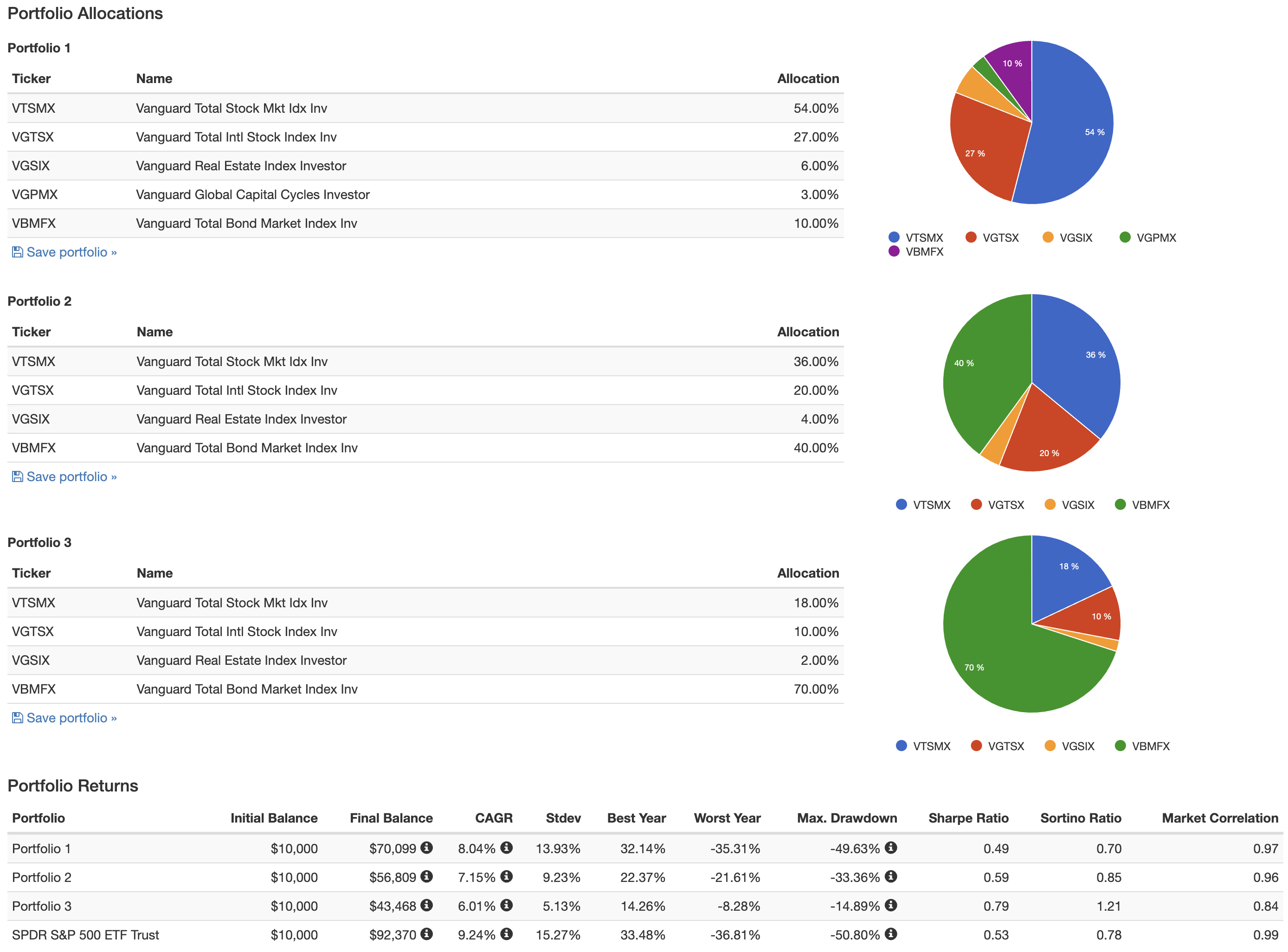 케빈의 기본 포트폴리오 전략에서 투자 범위를 좀더 확대하여 리츠(VGSIX,VNQ), 귀금속지수(VGPMX,GDX), 고금리양도성예금증서를 추가한 포트폴리오를 적용할 수도 있다. (아래 표에는 고금리양도성예금증서는 포함하지 않는 포트폴리오까지만 작성하였다 - 고금리양도성예금증서 투자를 위해서는 적극적 투자 방식을 따라야 하므로 활용하기 쉽지 않다)