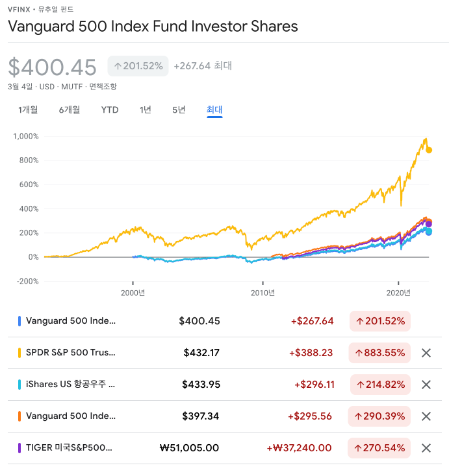 - 파란색: VFINX, 노란색: SPY, 민트색: IVV, 주황색: VOO, 보라색: TIGER미국S&P500선물(H)
