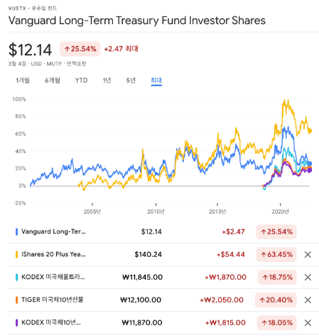 - 파란색: VUSTX, 노란색: TLT, 민트색: KODEX미국채울트라30년선물(H)