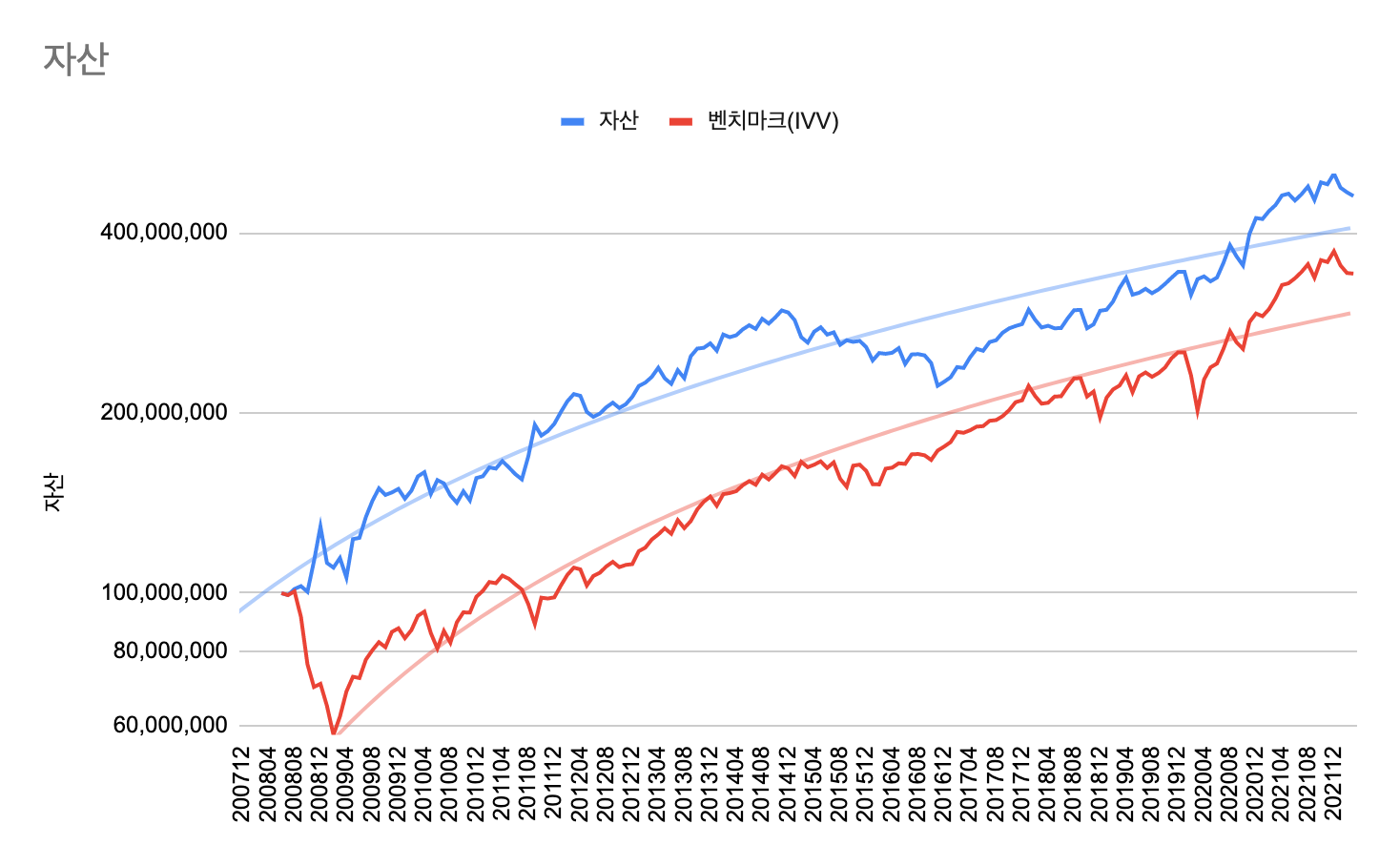 - 2019.01에 1억원을 투자할 경우, 2021년 12월말 기준으로 약 1.4억원이 된다. (47.18% 수익률)