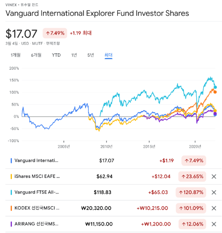 - 파란색: VINEX, 민트색: VSS, 보라색: ARIRANG선진국MSCI(합성H)