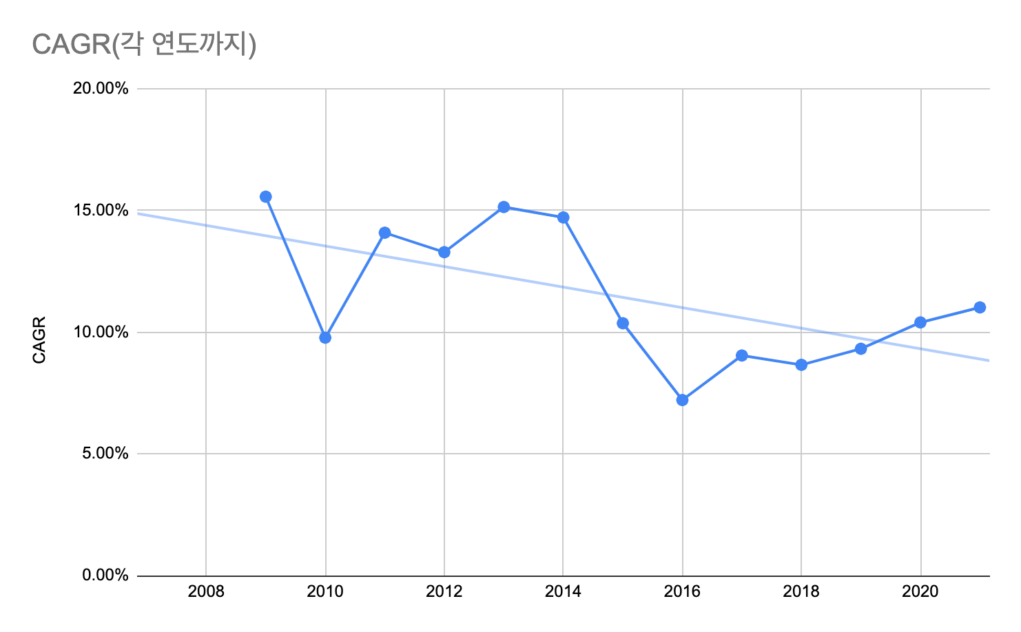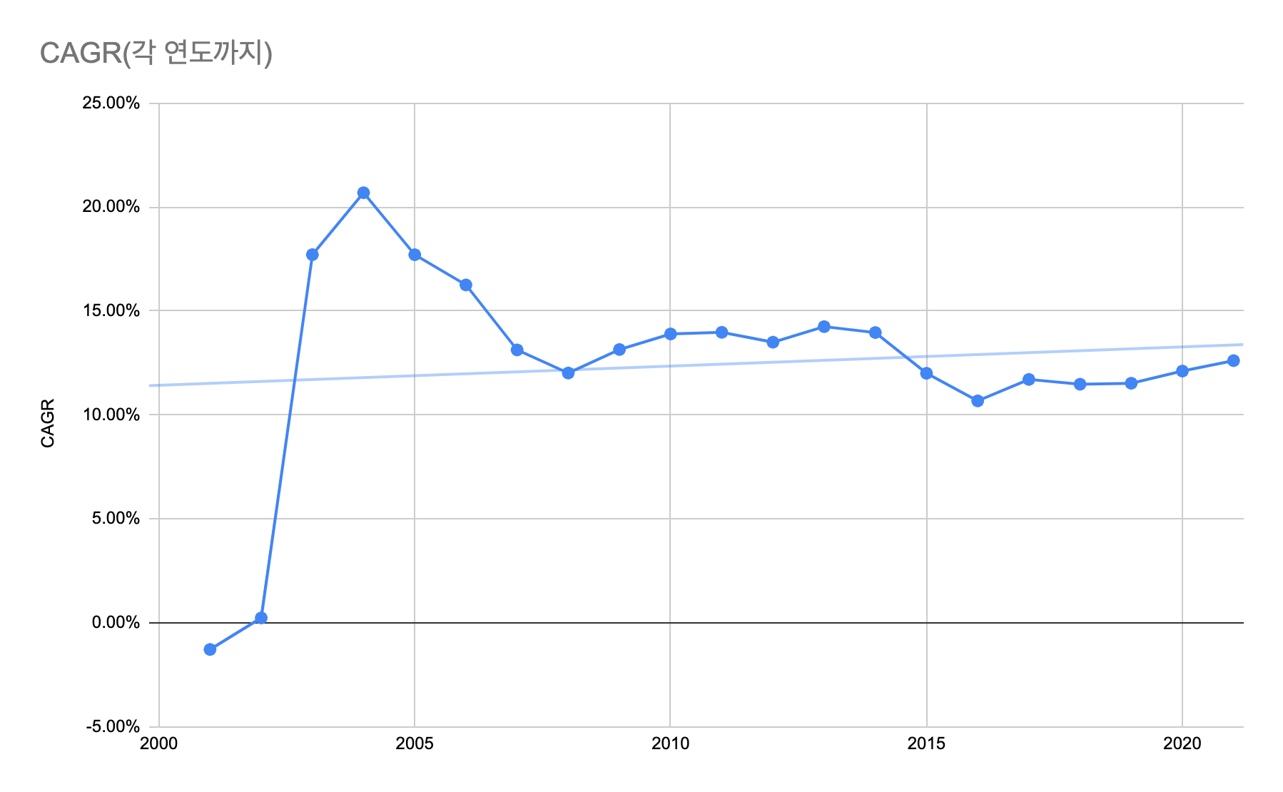 아래 차트에서 X=2005인 점의 값은 2000년 1월부터 2005년 12월까지 측정된 CAGR이며, X=2021인 점은 2000년 1월부터 2021년 12월까지 측정된 CAGR 값을 의미한다. 각 점의 추세선(차트 상 직선)을 그려 보면 감소하지 않고 있으므로 전략의 유효성이 유지된다고 볼 수 있다.