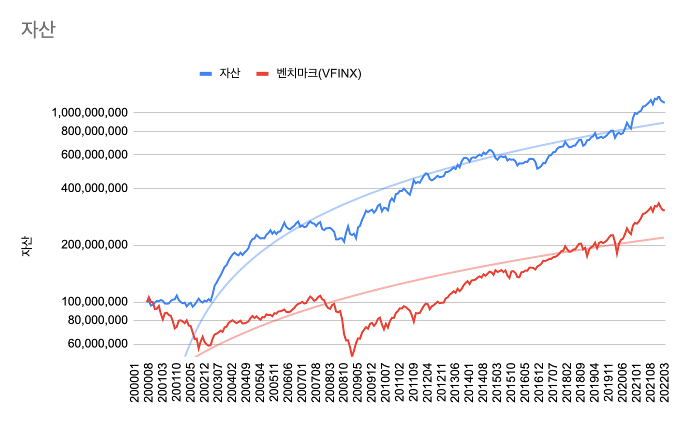 2000년 1월에 1억원을 투자할 경우, 2021년 12월말 기준으로 약 12억원이 된다(1,127% 수익률). 해당 기간 동안 연 수익률(CAGR)은 12.61%이다.