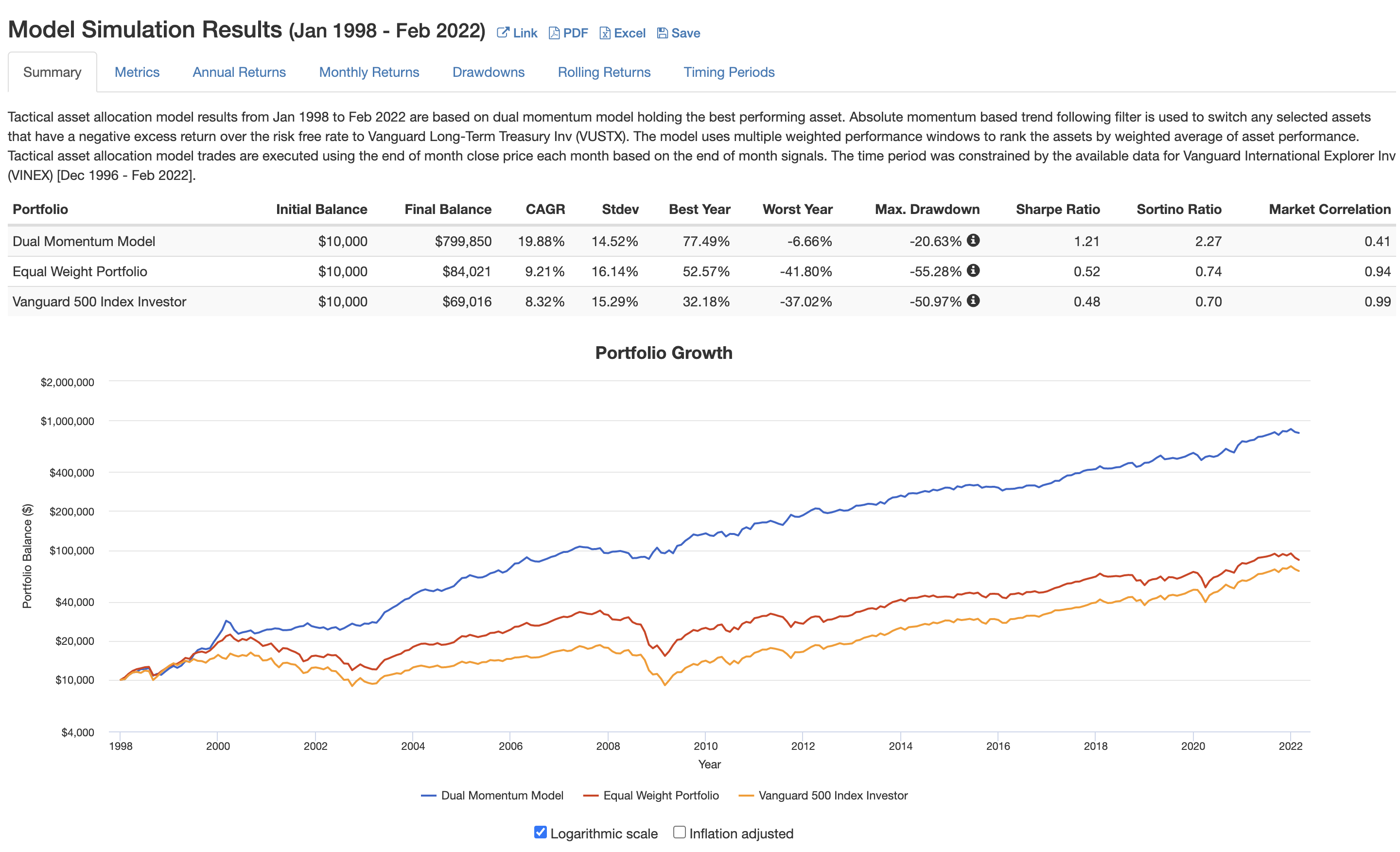 가속듀얼모멘텀 전략에 대해 엔지니어드 포트폴리오가 제시하는 백테스트 결과(portfolio visualizer)는 다음과 같다.