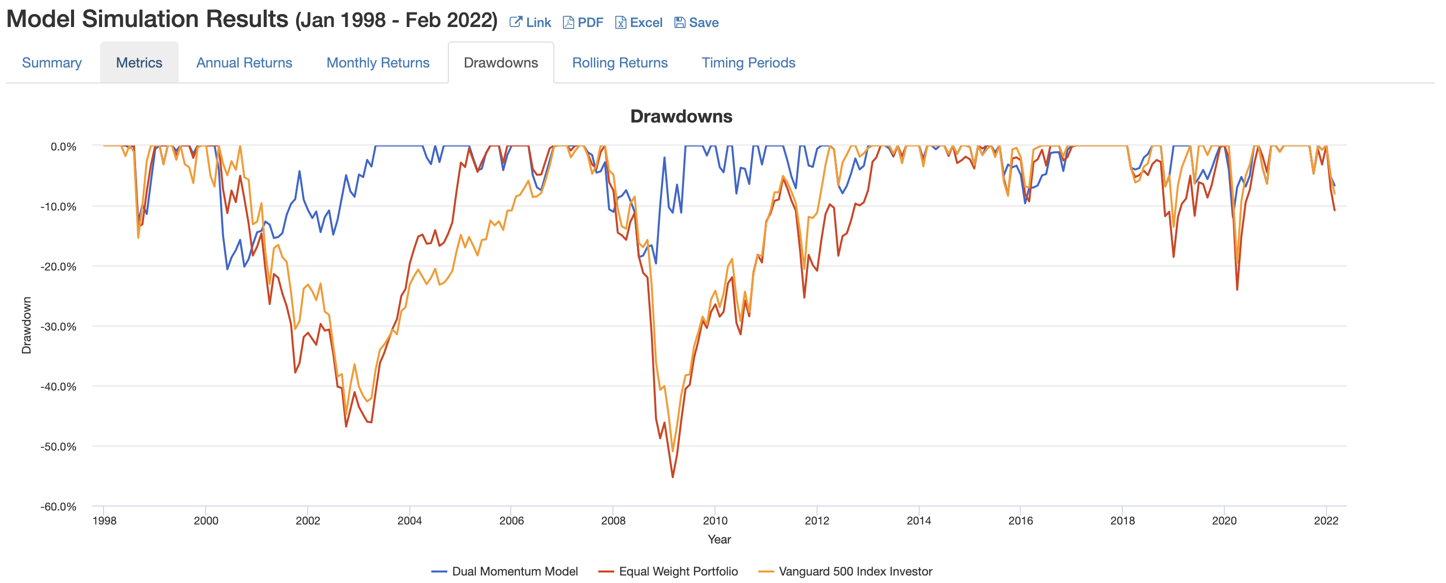 오리지널 자산인 VFINX, VINEX, VUSTX 펀드를 이용하여 2000.01부터 2021.12까지 백테스트한 결과는 다음과 같다.